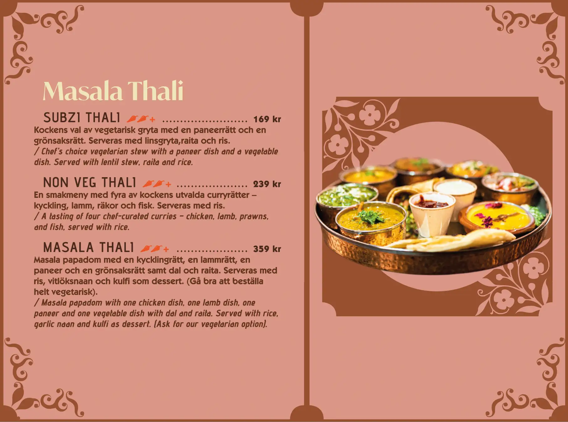 Tillbehör Naan/Roti Vegetariskt Från Havet Street Kitchen Chicken Chef’s Choice Lamm Tandoori Masala Thali Craving Corner Masala Biryani Masala Sharing Desserts Southern Coast (Lundby only)